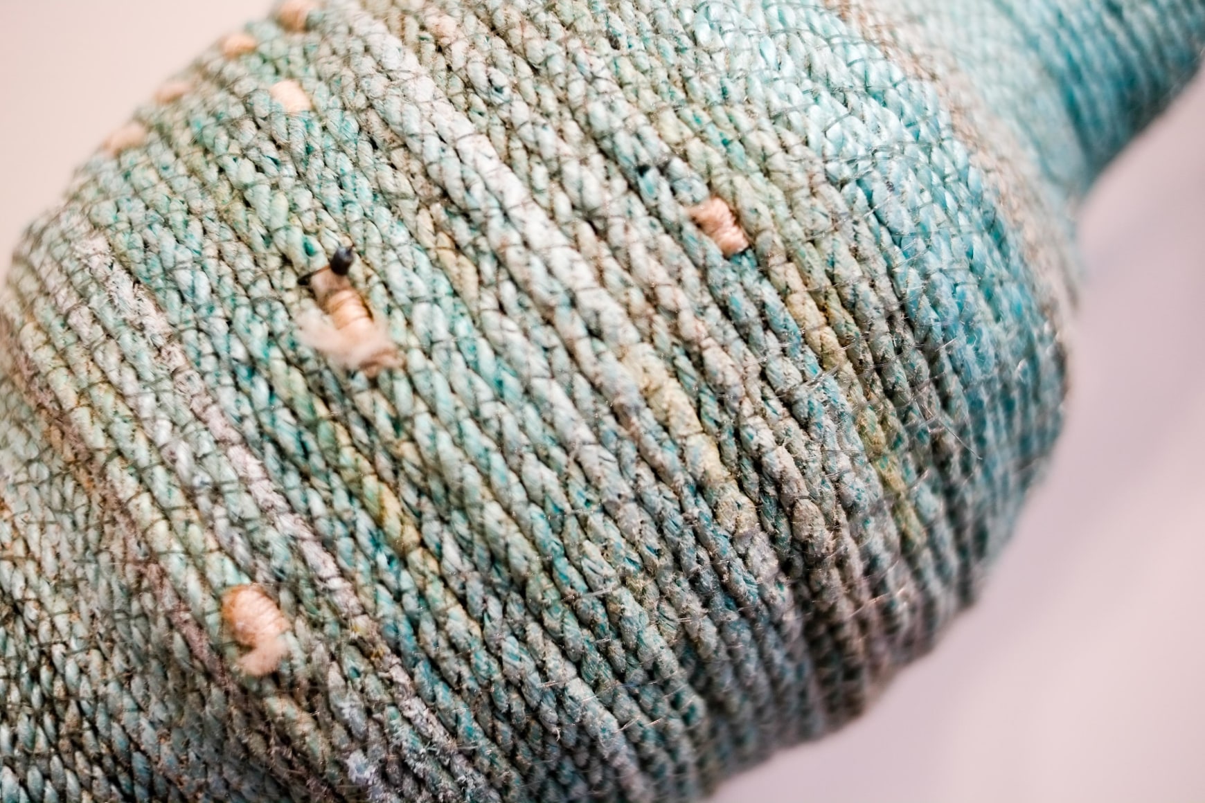 The trials of a castaway life have imparted incredible battle scars on the rope. Leitmanis was drawn to her medium for its character, and the dissonance it represents.