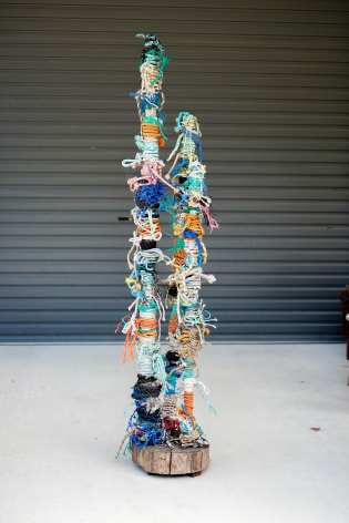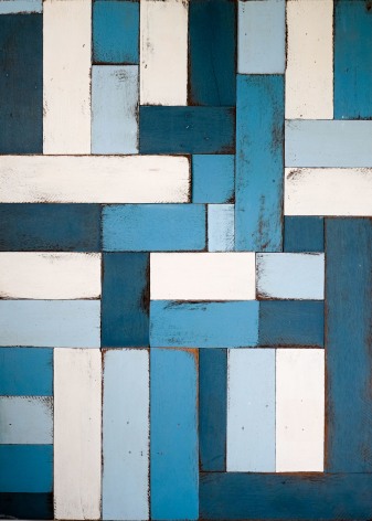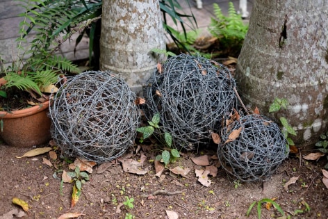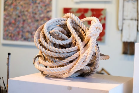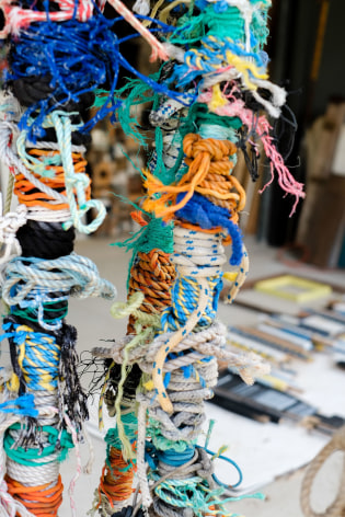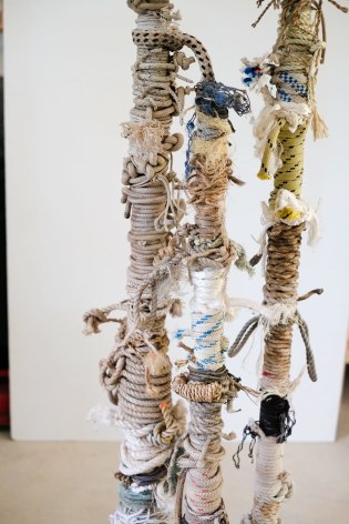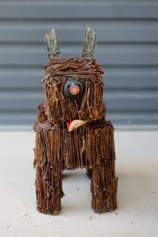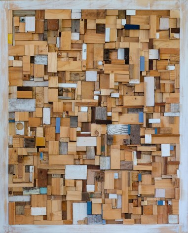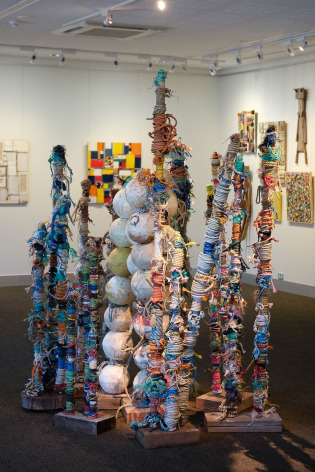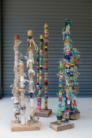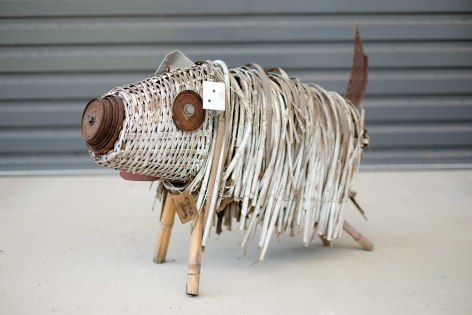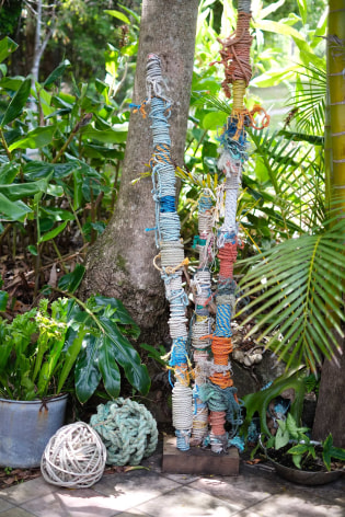 The materials l use are all recycled or reclaimed goods. The mediums range from bamboo blinds, chairs and bed heads, rusted metal, nails and screws, driftwood, shells, rope from the beach, matches, paper, cardboard, plastics and electrical wire.