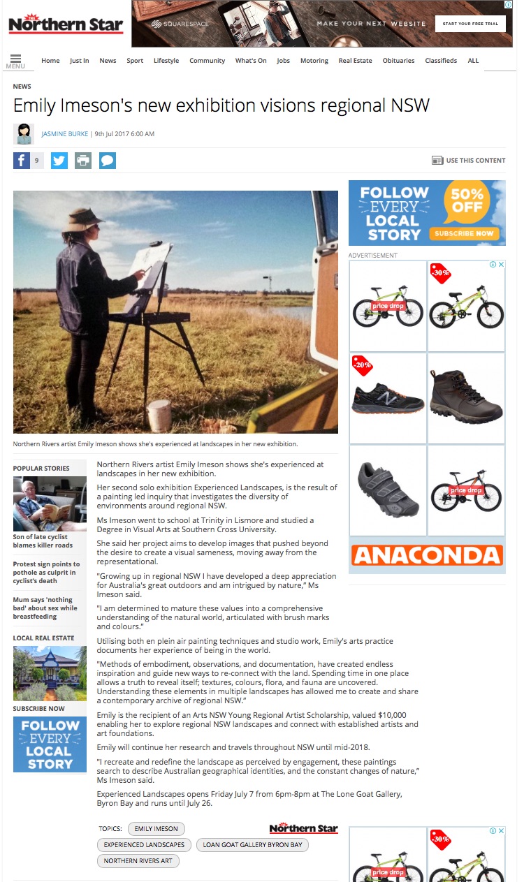 Emily is the recipient of Arts NSW Young Regional Artist Scholarship, enabling her to explore regional NSW landscapes and connect with established artists and art foundations.