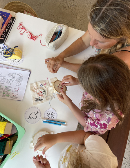 Kids (and adults!) are welcome to come and learn some simple stitching techniques, taking inspiration from the embroidered works in the space.