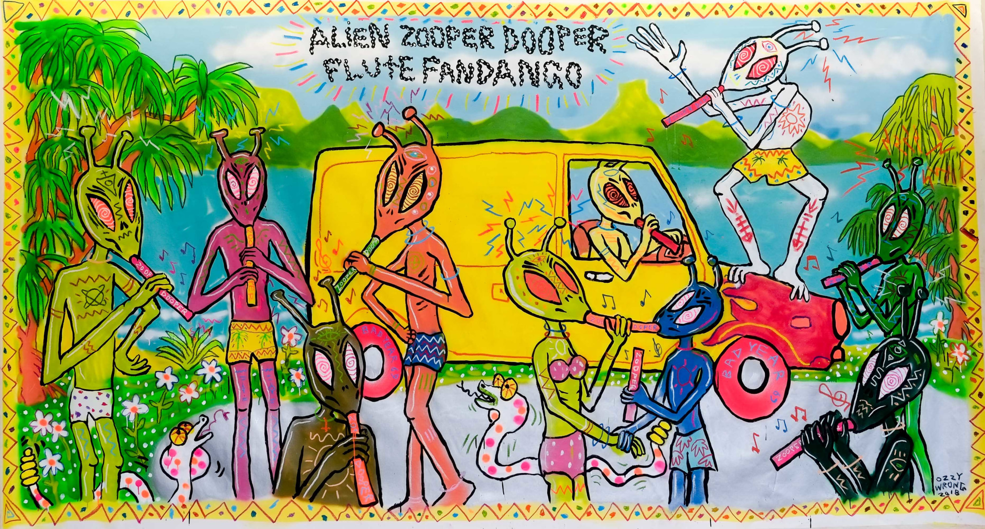 Like Egon Schiele, Andy Warhol, Roy Lichtenstein, Carl Sagan, David Suzuki and Banksy in a blender, Ozzie fuses graffiti, pop art, autobiography, cosmic psychedelia, eco-political activism and self-help into an eyeball-searing mix all of his own. Using every media available and painting anything that will stand still long enough, Ozzie's work has featured on innumerable surfboards, record covers, band flyers, a range of ready-to-wear fashion, and in art exhibitions worldwide. Most recently Ozzie staged a sell-out solo show at Byron Bay's own Spot of Genius gallery, alongside collaborative murals up and down the East Coast and across the Pacific in Hawaii.