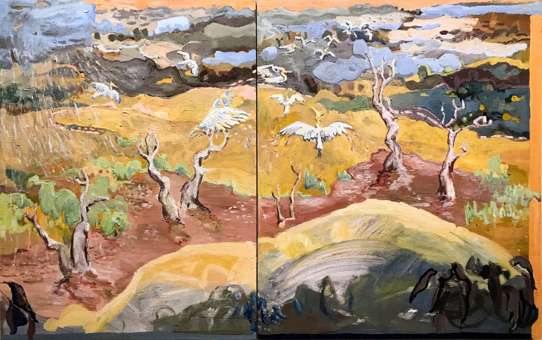Emily Imeson Billabong, Cattle Ibis, Wet Season Diptych, 2017 Oil on board 120cm x 190cm