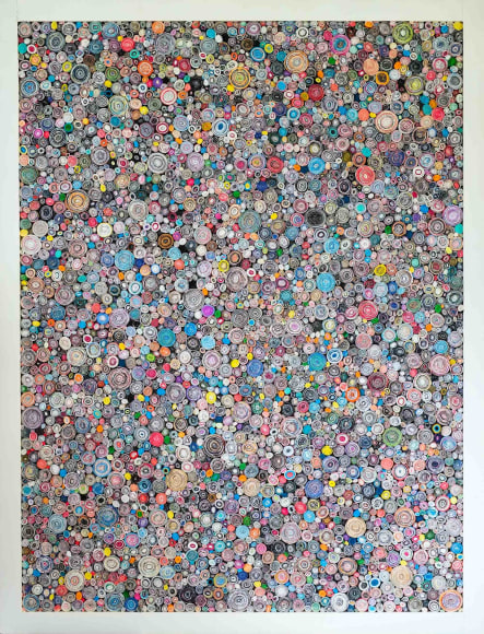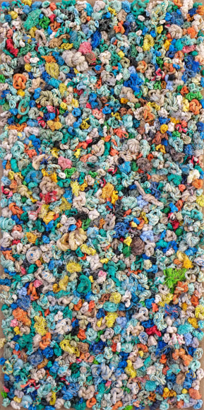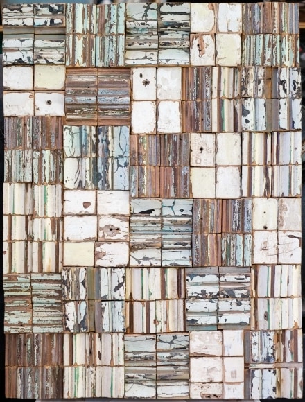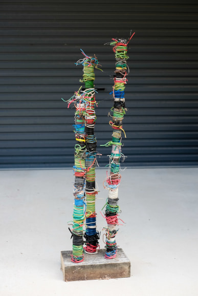 The materials l use are all recycled or reclaimed goods. The mediums range from bamboo blinds, chairs and bed heads, rusted metal, nails and screws, driftwood, shells, rope from the beach, matches, paper, cardboard, plastics and electrical wire.