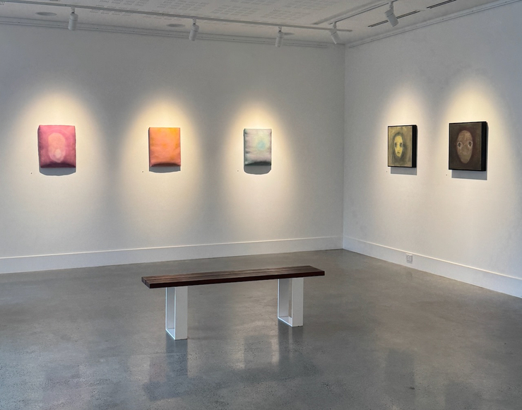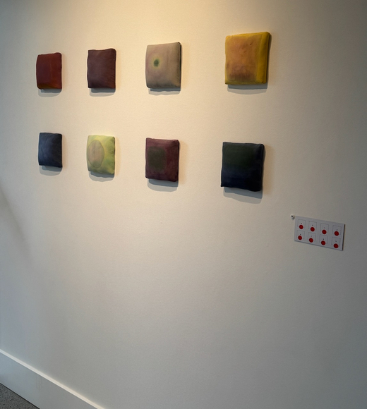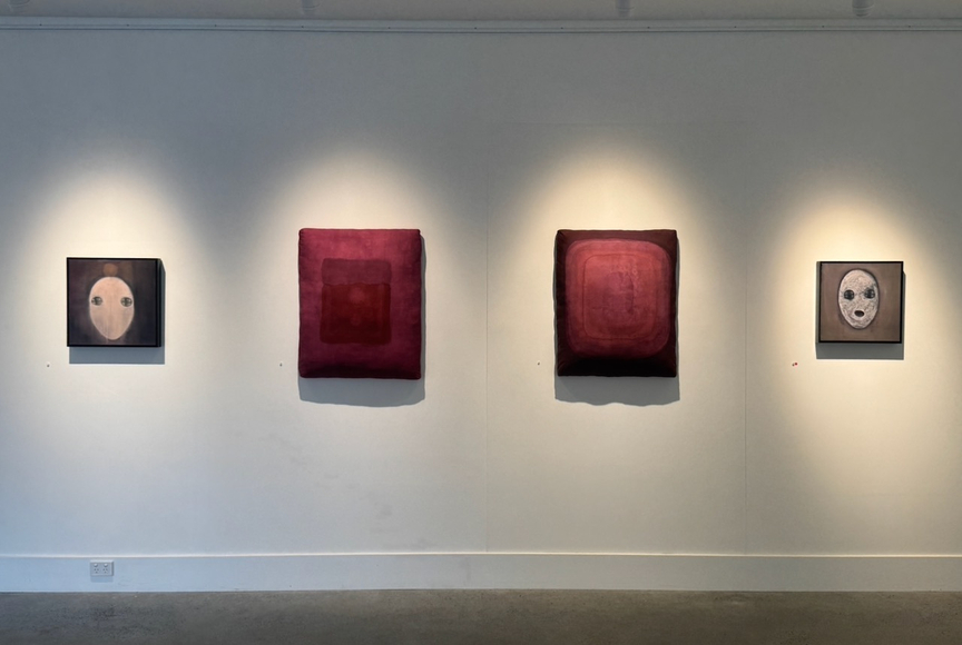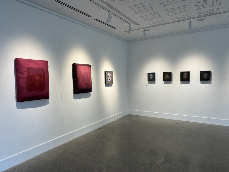 Swinton works with soft, sculptural canvases and gentle colour fields to explore quiet states of feeling and moments of transcendence. Some works are light and delicate, suggesting stillness; others are dense and deeply coloured, full of movement and contrast. Pillow-like forms and textured surfaces create a physical presence in the space, encouraging viewers to slow down and engage with a sense of care, intimacy, and subtle tension.