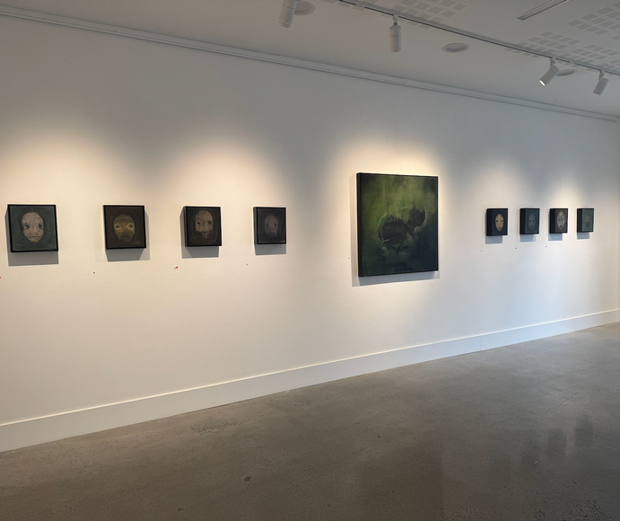 Rhodes presents portraits that function like masks, floating in a psychological, dreamlike space. Each figure emerges from an intuitive process, shaped by memory and emotion. Her paintings dig into the inner self, revealing traces of past experiences and deeper, archetypal feelings. Thick layers of oil paint hint at what lies beneath the surface – energies that remain even when partially concealed.