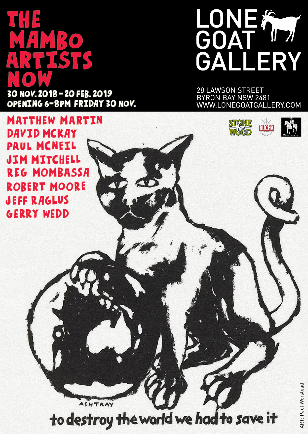 Lone Goat Gallery is proud to present new works by 8 of the original and most notorious Mambo artists: Matthew Martin, David McKay, Paul McNeil, Jim Mitchell, Reg Mombassa, Robert Moore, Jeff Raglus, Gerry Wedd.