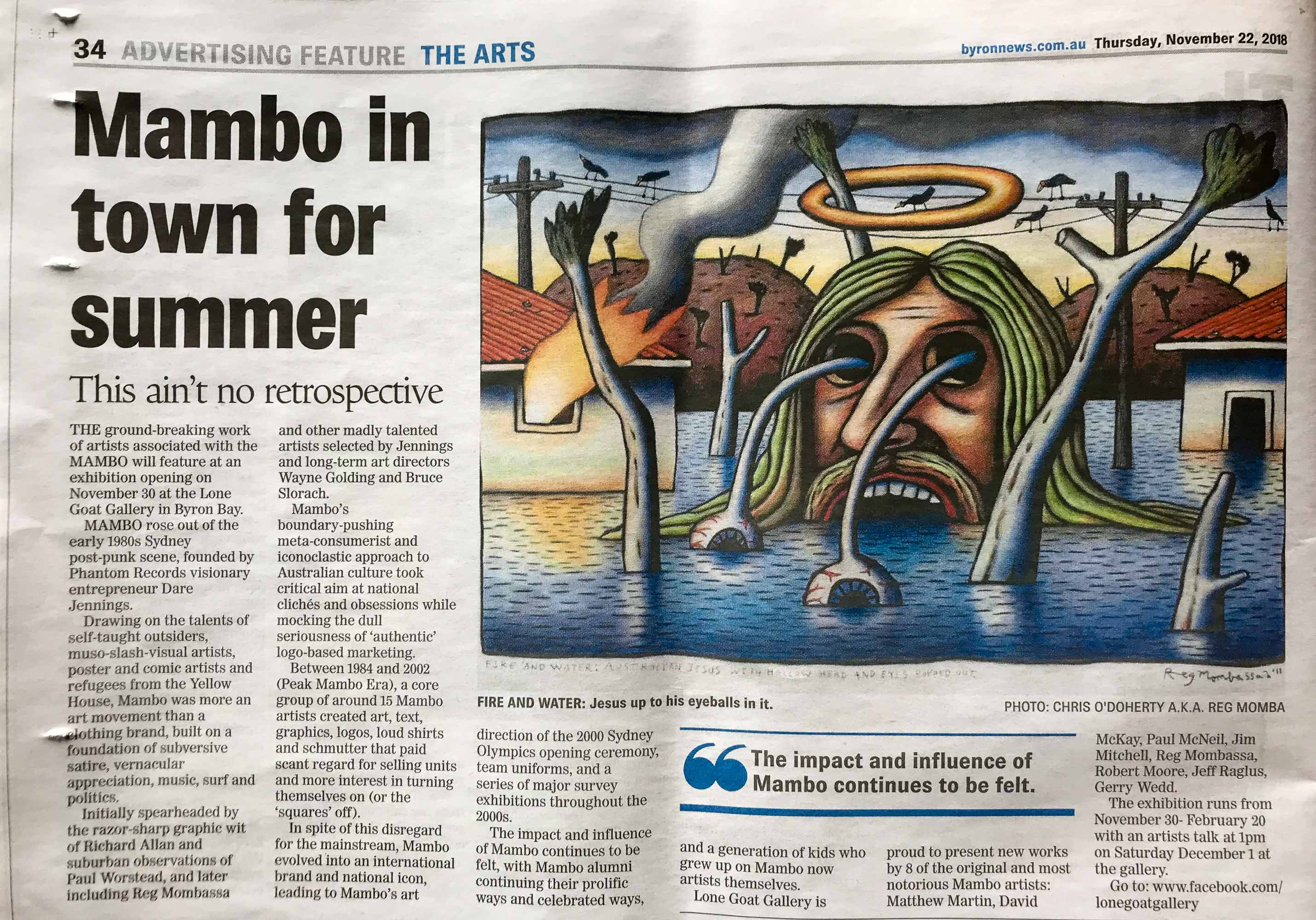 Reg Mombassa  Fire and water: Australian Jesus with hollow head and eyes popped out, 2018