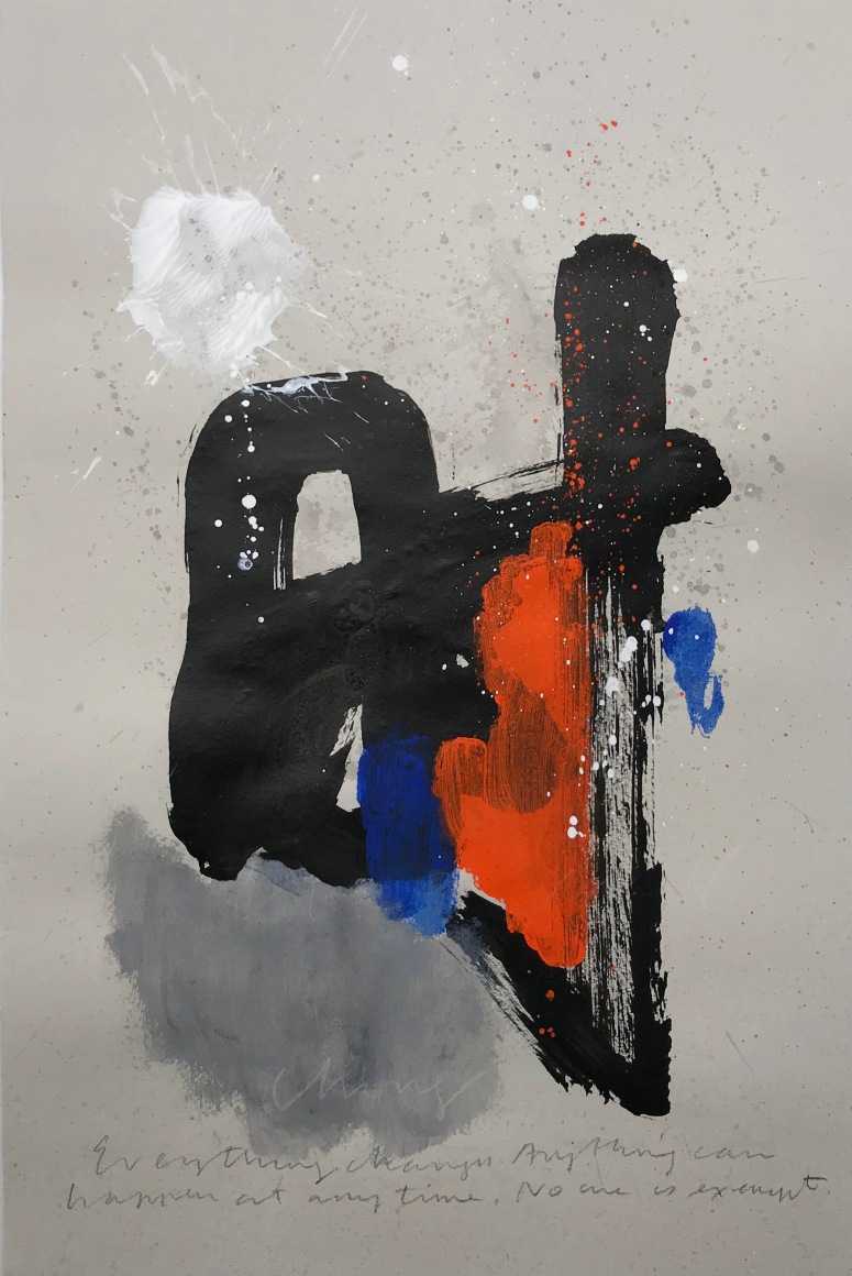 The themes here are change, exile and perhaps, freedom. Change can be seen in the way words (Chinese characters, English script) are transformed into near illegible marks to become abstract expressions, a different kind of sign with only subjective readings. How ink landscapes become groupings of bright coloured shapes. The way digital technology can marry with analogue processes to create a contemporary Chinese scroll. Exile is the great theme of the last hundred and some years and enough has been said about it. I mention exile only because it is undeniable.